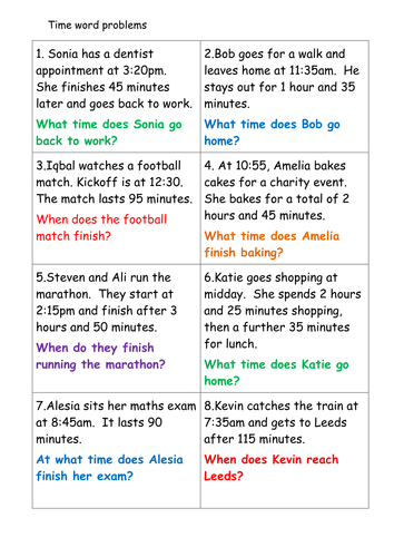 TIME WORD PROBLEMS - Free Math Worksheets - PDF Worksheets Improve your kids math knowledge with free questions in "time word problems" and thousands of other math skills. Get all the worksheets here! ... Time word problems helps kids to understand the time and elapsed time concept. PDF …